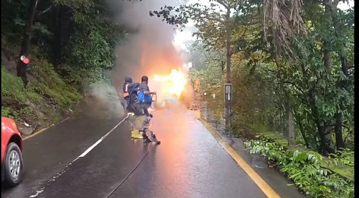 Thamarassery, ചുരം എട്ടാം വളവിനും, ഒൻപതാം വളവിനും ഇടയിൽ കാറിന് തീപിടിച്ചു, കൽപ്പറ്റയിൽ നിന്നും ഫയർഫോഴ്സ് എത്തി തീയണക്കുന്നു