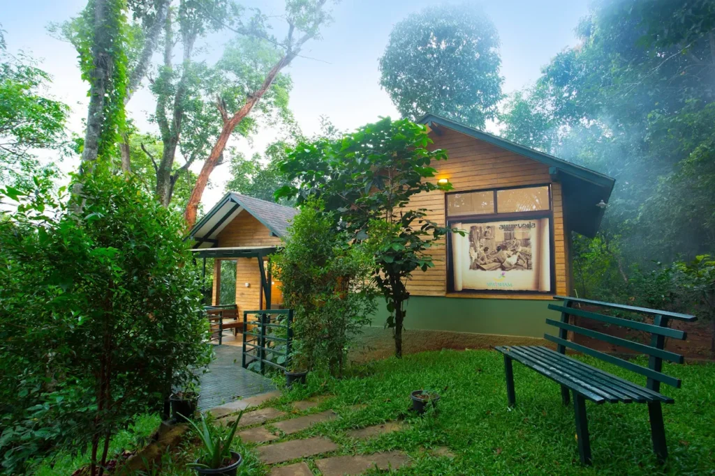 Adithya Nature Resort & Spa offers a range of elegant villas and cottages that combine luxury with nature-inspired aesthetics. The accommodations feature wooden interiors, private balconies with panoramic forest views, and modern amenities to ensure complete comfort. Each room is thoughtfully designed to create a warm and inviting ambiance, with large windows that allow natural light to fill the space. Guests can unwind while enjoying the scenic vistas of the surrounding hills, making their stay truly memorable.
