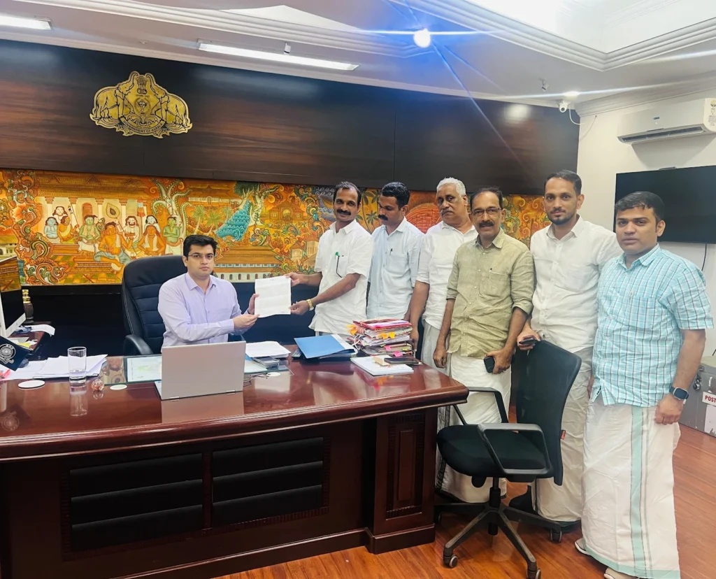 ഫോട്ടോ:ഓമശ്ശേരി പഞ്ചായത്ത് ഭരണസമിതി അംഗങ്ങൾ പ്രസിഡണ്ടിന്റെ നേതൃത്വത്തിൽ ജില്ലാ കളക്ടർക്ക് പരാതി നൽകുന്നു.