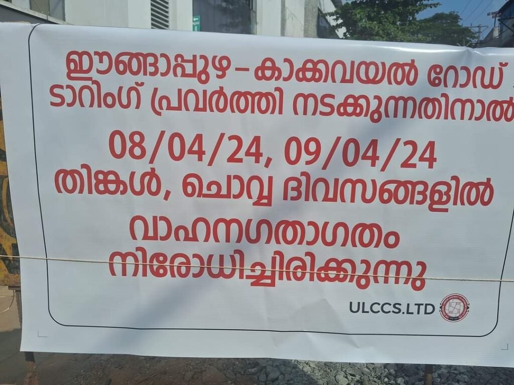ടാറിംഗ് പ്രവർത്തി നടക്കുന്നതിനാൽ തിങ്കൾ, ചൊവ്വ ദിവസങ്ങളിൽ Engapuzha- കാക്കവയൽ റോഡിൽ ഗതാഗതം നിരോധിച്ചു.